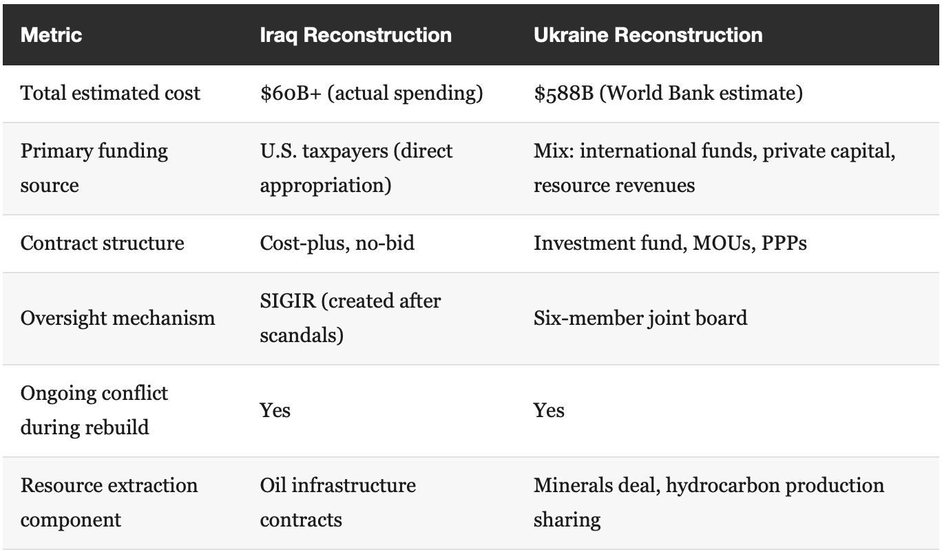 The Ukraine arrangement is different. The funding comes from private capital and resource revenues, not taxpayer appropriation. The contracts are investment partnerships, not cost-plus billing. The oversight includes equal Ukrainian board representation. But the underlying dynamic resonates. There is a country in crisis. American firms are well-positioned. Then terms are negotiated when one side has far more power than the other. While the details differ, the inexorable pull is the same.