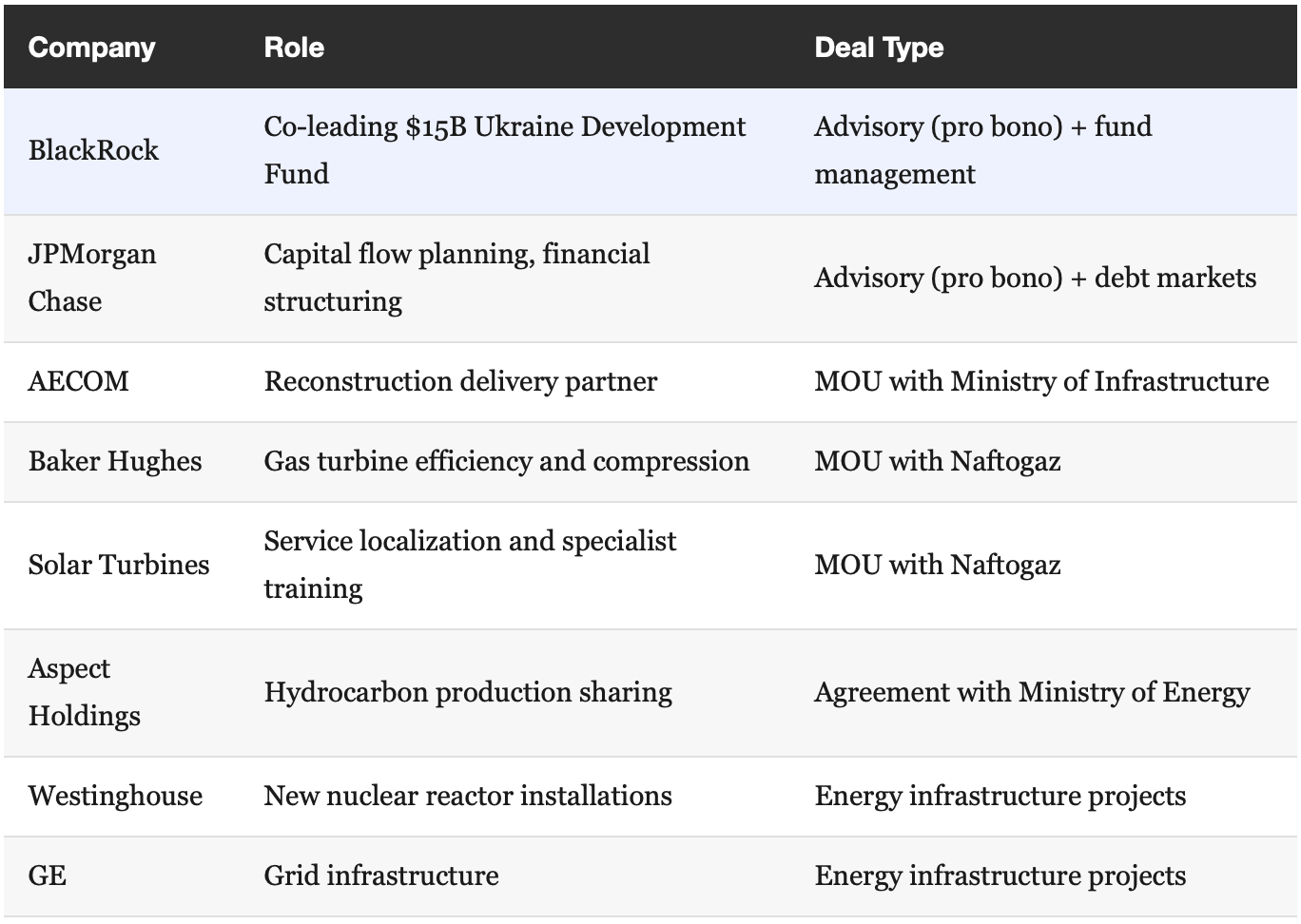 BlackRock was hired by Ukraine in November 2022 to attract reconstruction capital. JPMorgan joined in February 2023 for its debt markets expertise. Both are working pro bono; for now. Their Ukraine Development Fund has gathered $500 million in committed capital and targets $15 billion total. In March 2026, Ukraine’s Energy Minister signed new agreements with Baker Hughes, Solar Turbines, and Aspect Holdings in Washington, with the DFC exploring $1.4 billion in credit support for energy equipment. These companies bring real capabilities Ukraine needs, not simply predatory goals. But the pattern is familiar: American capital arrives first, secures the contracts, and sets the terms while the client country has limited bargaining power.